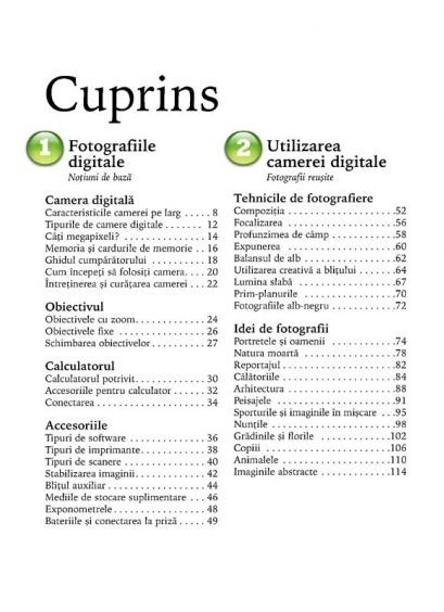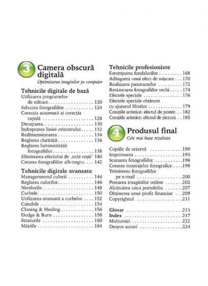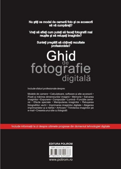 Editie noua Fotografii de David Jones Traducere de Delia Iordache si Ioana Aneci Coeditare cu Quercus Publishing Plc, Marea Britanie Un ghid ilustrat care va ofera numeroase sfaturi utile: de la cum sa alegeti camera foto pina la cele mai avansate tehnici de fotografie digitala Include informatii la zi despre ultimele progrese din domeniul tehnologiei digitale Nu stiti ce model de camera foto si ce accesorii sa va cumparati? Vreti sa aflati cum puteti sa faceti fotografii mai reusite si sa retusati imaginile? Sinteti pregatit sa obtineti rezultate profesioniste? Include sfaturi profesionale despre: Modele de camere • Calculatoare, software si alte accesorii • Pixeli si marirea dimensiunilor imaginii • Memorie • Salvarea imaginilor • Expunere • Compozitie • Lumina • Functiile camerei • Efecte speciale • Manipularea imaginilor • Retusarea fotografiilor vechi • Imprimarea imaginilor digitale • Alegerea imprimantelor si a hirtiei • Arhivare • Trimiterea imaginilor pe e-mail • Crearea unui site cu fotografii
