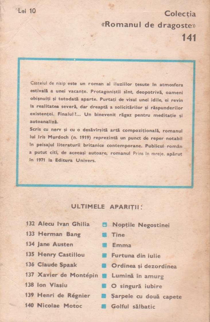 Comandă online cartea "Castelul de nisip" la 13,60 lei scrisă de Iris Murdoch, tiparită la editura Eminescu în anul 1977 cu un număr de 316 pagini. cu plata ramburs sau online cu cardul. Momentan titlul "Castelul de nisip" nu este disponibil însa vă puteți înscrie pentru a fi notificat în momenul reaprovizionarii.