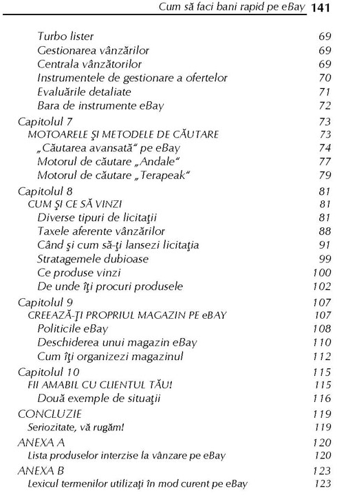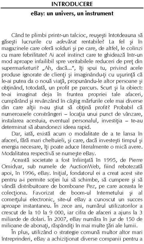Pe eBay, se cumpară câte o Corvette la fiecare oră, un diamant se negociază la fiecare două minute, treisprezece CD-uri îşi schimbă proprietarul la fiecare minut, o cameră foto digitală se negociază la fiecare patruzeci de secunde şi un obiect de îmbrăcăminte la fiecare trei sferturi de secundă! Altfel spus, dacă ai un obiect, oricare ar fi el, pe care nu-l mai vrei, există probabil cineva, undeva, care îl caută. Cum să procedezi pentru a vinde ceea ce nu mai vrei? Exact asta o să înveţi din această carte. Mai mult chiar, descoperind principiile de bază care guvernează vânzarea şi cumpărarea de articole pe eBay, o să te poţi lansa în afaceri, fara un angajament financiar important. Investind doar câtva timp şi puţină energie, vei fi în măsură să faci o mica avere. Imediat ce vei termina lectura acestei carţi, o să poţi demara propria afacere utilizând acest site extraordinar drept instrument de vânzare.