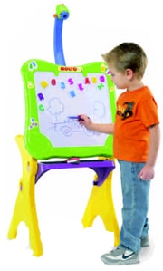 | Descriere | Este o jucarie multifunctionala cu proiector care are urmatoarele functii: - tabla de scris si desen - birou - tabla cu litere magnetice - proiector Cu ajutorul celor 6 discuri (7 imagini / disc) puteti desena o multime de imagini care sunt proiectate pe tabla. Setul include scaunel, discuri cu diferite imagini, marker, 26 de litere magnetice si un burete. 4 baterii AA Lungime: 126 cm |