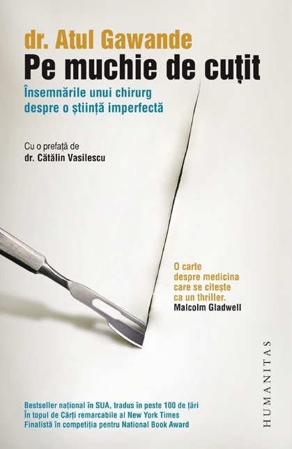 În lumea largă, la fel ca în România, chirurgul pare a fi un om care ştie tot mai multe despre tot mai puţin, într-un domeniu din ce în ce mai inaccesibil laicilor. Câteodată însă, ca o excepţie necesară, apare şi câte unul care ştie nu numai chirurgie, ci şi să scrie ca un scriitor. Ştie şi despre ce să scrie şi cum să o facă, ducând în lumea largă povestea frământărilor din lumea închisă a chirurgiei. O face onest şi captivant, punând întrebările bine şi luându-l pe cititor părtaş la căutarea răspunsurilor. Cu un talent de autor de romane poliţiste, Gawande reuşeşte să ne aducă în faţa ochilor pacienţi cu probleme reale, o lume vie care dezvăluie cititorului lucruri altminteri teribil de greu de explicat pe înţelesul lui. Tot haţişul de dificultăţi al deciziei chirurgicale, cu problematica acordului informat al pacientului, cu detalii care nu sunt simple decât pentru birocraţia juridică, dar care, în realitate, sunt la fel de complicate ca viaţa. Căci e vorba despre decizia unui om, chirurgul, asupra destinului altui om, pacientul. (Dr. Cătălin Vasilescu)