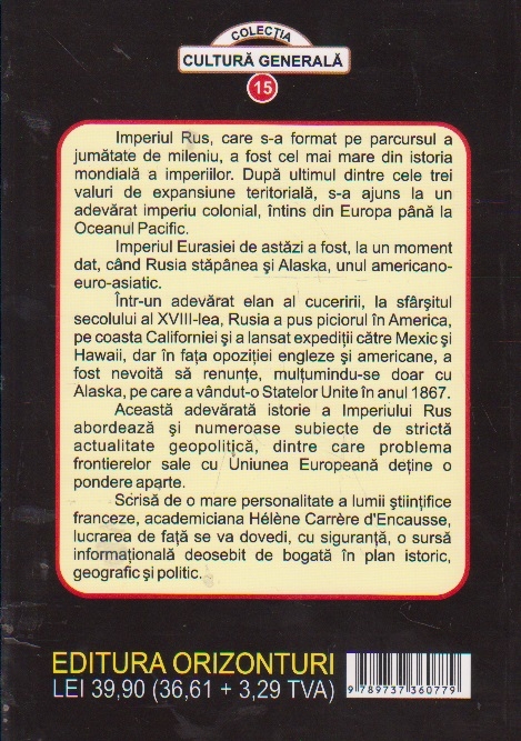 Comandă online cartea "Imperiul Eurasiei. O istorie a imperiului rus de la 1552 pana astazi" la 26,40 lei scrisă de Helene Carrere d Encausse, tiparită la editura Orizonturi în anul 2009 cu un număr de 264 pagini. cu plata ramburs sau online cu cardul. Momentan titlul "Imperiul Eurasiei. O istorie a imperiului rus de la 1552 pana astazi" nu este disponibil însa vă puteți înscrie pentru a fi notificat în momenul reaprovizionarii.