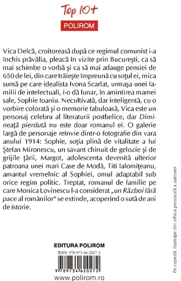 Vica Delca, croitoreasa dupa ce regimul comunist i-a inchis pravalia, pleaca in vizite prin Bucuresti, ca sa mai schimbe o vorba si ca sa mai adauge pensiei de 650 de lei, din care traieste impreuna cu sotul ei, mica suma pe care idealista Ivona Scarlat, urmasa unei familii de intelectuali, i-o da lunar, in amintirea mamei sale, Sophie Ioaniu. Necultivata, dar inteligenta, cu o vorbire colorata si o memorie fabuloasa, Vica este un personaj celebru al literaturii postbelice, dar Dimineata pierduta nu este doar romanul ei. O galerie larga de personaje reinvie dintr-o fotografie din vara anului 1914: Sophie, sotia plina de vitalitate a lui Stefan Mironescu, un savant chinuit de gelozie si de grijile tarii, Margot, adolescenta devenita ulterior patroana unei mari Case de Moda, Titi Ialomiteanu, amantul vremelnic al Sophiei, omul adaptabil sub orice regim politic. Treptat, romanul de familie pe care Monica Lovinescu l-a considerat „un Razboi fara pace al romanilor” se extinde, acoperind o suta de ani de istorie.