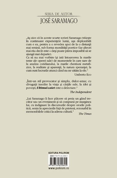Traducere din limba portugheza si note de Simina Popa Traducere din limba spaniola de Lavinia Similaru Ultimul caiet al lui Jose Saramago reproduce textele scrise pentru blog din martie 2009 si pina in iunie 2010, pe linga alte citeva eseuri din arhiva autorului, „adormite”, cum spune in prologul sau Pilar del Rio, sotia autorului, insa de mare actualitate. Acest prolog, impreuna cu citeva dintre insemnarile din perioada octombrie 2009 – iunie 2010, repro­duse la sfirsitul volumului de fata, au fost preluate din editia spa­niola a Ultimului caiet si traduse de Lavinia Similaru, in timp ce corpul volumului respecta editia portugheza, in traducerea Siminei Popa. Editia romaneasca si‑a dorit sa cuprinda ultimele cuvinte ale lui Saramago, dictate familiei, cind nu mai putea sa scrie, insa conti­nua sa observe lumea din jur, cu aceeasi vigilenta fata de cauzele sociale, mentinind taisul polemicilor politice si reli­gioase, conti­nuind critica literara, constient si fascinant pina in ultima clipa. „As zice ca in aceste scurte scrieri Saramago traieste in continuare experientele lumii, asa deplorabila cum e ea, pentru a o revedea apoi de la o distanta mai senina, sub forma moralitatii poetice (iar alteori mai rau decit este – desi poate parea imposibil sa se ajunga mai departe). Ca sa nu mai vorbim (si iata intoarcerea la marile teme ale operei sale) de momentele in care sare de la analiza cotidianului, la marile chestiuni metafizice, la realitate si aparenta, la natura sperantei, la cum sint lucrurile atunci cind nu ne uitam la ele.” (Umberto Eco) „Intr-un stil provocator si simplu, dulce-amar, cu divagatii insolite la viata si cartile sale, la idei si povesti, Ultimul caiet este o delectare.” (The Independent) „Lui Saramago ii face placere sa preia un gind trecator sau un eveniment si sa compuna pe marginea lui, cu indignare in discursurile despre ororile politicii, senin in aprecierile fata de prieteni, rezonabil in memorabilele critici la adresa culturii.” (The Times)