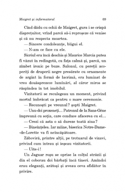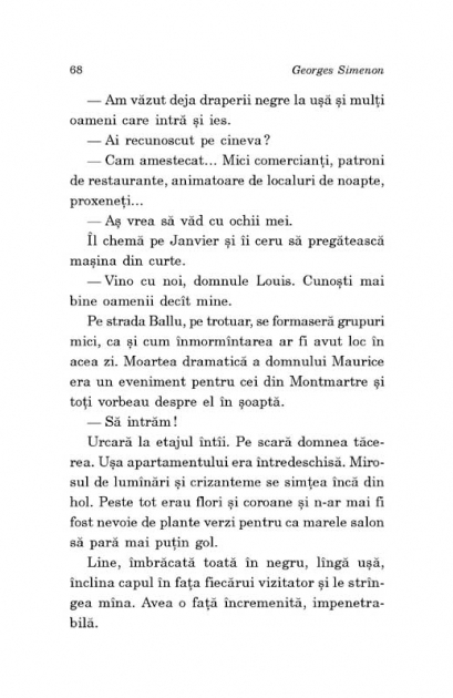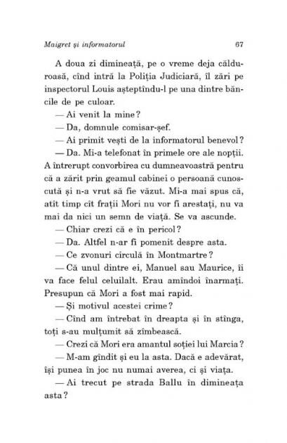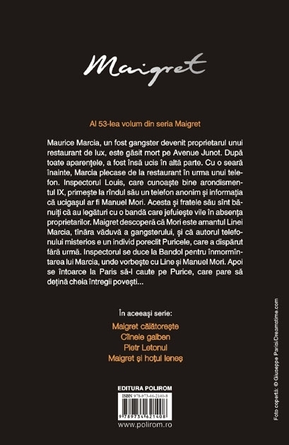 Traducere de Nicolae Constantinescu Al 53-lea volum din seria Maigret Maurice Marcia, un fost gangster devenit proprietarul unui restaurant de lux, este gasit mort pe Avenue Junot. Dupa toate aparentele, a fost insa ucis in alta parte. Cu o seara inainte, Marcia plecase de la restaurant in urma unui telefon. Inspectorul Louis, care cunoaste bine arondismentul IX, primeste la rindul sau un telefon anonim si informatia ca ucigasul ar fi Manuel Mori. Acesta si fratele sau sint banuiti ca au legaturi cu o banda care jefuieste vile in absenta proprietarilor. Maigret descopera ca Mori este amantul Linei Marcia, tinara vaduva a gangsterului, si ca autorul telefonului misterios e un individ poreclit Puricele, care a disparut fara urma. Inspectorul se duce la Bandol pentru inmormintarea lui Marcia, unde vorbeste cu Line si Manuel Mori. Apoi se intoarce la Paris sa-l caute pe Purice, care pare sa detina cheia intregii povesti...