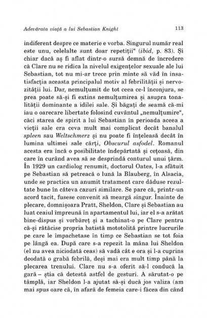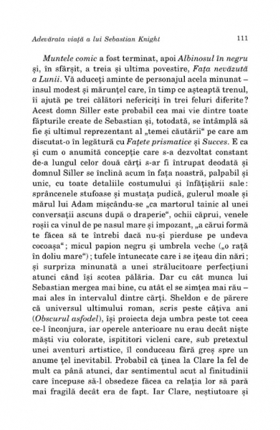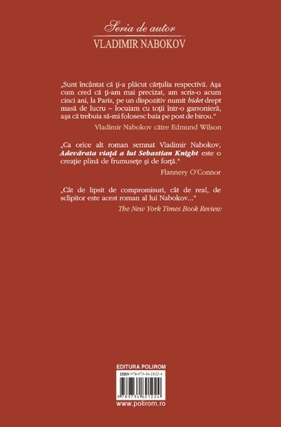Traducere inedita din limba engleza de Anca Baicoianu Adevarata viata a lui Sebastian Knight este primul roman scris in limba engleza de catre Nabokov, in perioada pe care a petrecut-o, in saracie, la Paris. Naratorul, V., este prins in prima sa incercare literara, aceea de a scrie o biografie decenta si realista a fratelui sau vitreg, celebrul romancier Sebastian Knight. Pentru a reusi acest lucru, va reface traseul vietii acestuia, ii va intervieva colegii de la Cambridge, prietenii si fostele iubite. Totul pentru a combate biografia oficiala, eronata, scrisa de fostul secretar al lui Sebastian Knight, Goodman. Finalul nu aduce cu el o lamurire a misterelor ce-l inconjurau pe Knight, ci-l va adinci pe V. din ce in ce mai mult in opera fratelui sau, pina la asimilare. Intrebarea care se pune este daca nu cumva V. e personajul unui roman scris de Sebastian Knight... „Sint incintat ca ti-a placut cartulia respectiva. Asa cum cred ca ti-am mai precizat, am scris-o acum cinci ani, la Paris, pe un dispozitiv numit bidet drept masa de lucru – locuiam cu totii intr-o garsoniera, asa ca trebuia sa-mi folosesc baia pe post de birou.” (Vladimir Nabokov catre Edmund Wilson) „Ca orice alt roman semnat Vladimir Nabokov, Adevarata viata a lui Sebastian Knight este o creatie plina de frumusete si de forta.” (Flannery O’Connor) „Cit de lipsit de compromisuri, cit de real, de sclipitor este acest roman al lui Nabokov...” (The New York Times Book Review)
