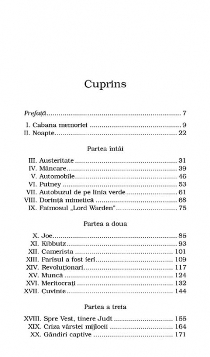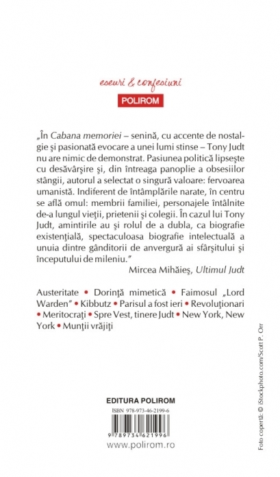 Traducere de Cristina Cheveresan „In Cabana memoriei – senina, cu accente de nostalgie si pasionata evocare a unei lumi stinse – Tony Judt nu are nimic de demonstrat. Pasiunea politica lipseste cu desavirsire si, din intreaga panoplie a obsesiilor stingii, autorul a selectat o singura valoare: fervoarea umanista. Indiferent de intimplarile narate, in centru se afla omul: membrii familiei, personajele intilnite de-a lungul vietii, prietenii si colegii. In cazul lui Tony Judt, amintirile au si rolul de a dubla, ca biografie existentiala, spectaculoasa biografie intelectuala a unuia dintre ginditorii de anvergura ai sfirsitului si inceputului de mileniu.” (Mircea Mihaies, Ultimul Judt)
