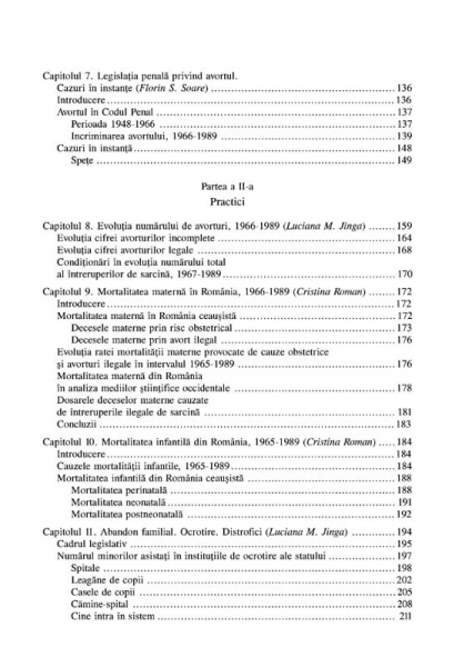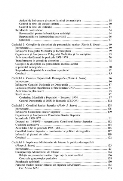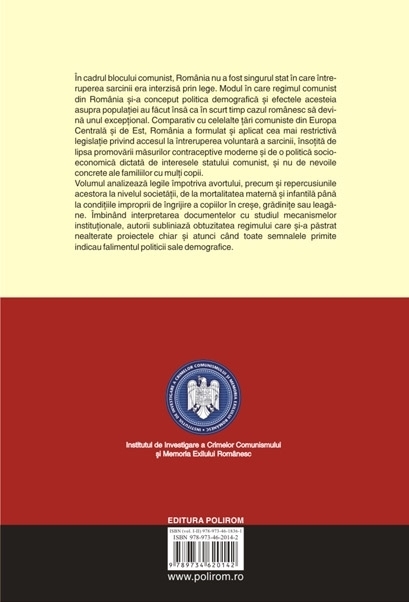 Institutul de Investigare a Crimelor Comunismului si Memoria Exilului Romanesc Cuvint inainte de Mihaela Miroiu In cadrul blocului comunist, Romania nu a fost singurul stat in care intreruperea sarcinii era interzisa prin lege. Modul in care regimul comunist din Romania si-a conceput politica demografica si efectele acesteia asupra populatiei au facut insa ca in scurt timp cazul romanesc sa devina unul exceptional. Comparativ cu celelalte tari comuniste din Europa Centrala si de Est, Romania a formulat si aplicat cea mai restrictiva legislatie privind accesul la intreruperea voluntara a sarcinii, insotita de lipsa promovarii masurilor contraceptive moderne si de o politica socioeconomica dictata de interesele statului comunist, si nu de nevoile concrete ale familiilor cu multi copii. Volumul analizeaza legile impotriva avortului, precum si repercusiunile acestora la nivelul societatii, de la mortalitatea materna si infantila pina la conditiile improprii de ingrijire a copiilor in crese, gradinite sau leagane. Imbinind interpretarea documentelor cu studiul mecanismelor institutionale, autorii subliniaza obtuzitatea regimului care si-a pastrat nealterate proiectele chiar si atunci cind toate semnalele primite indicau falimentul politicii sale demografice.