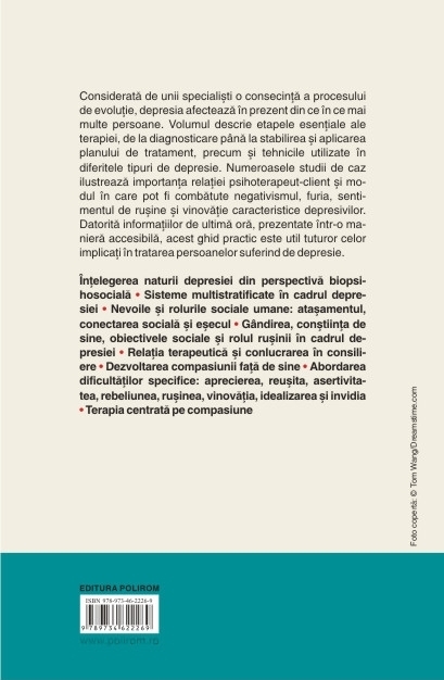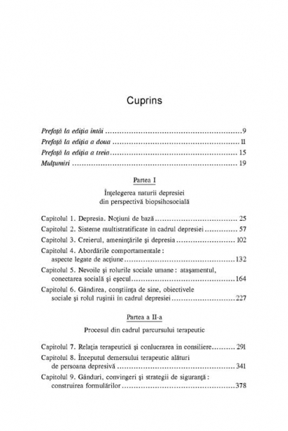 Traducere de Iulian Moga si Iustina Cojocaru Considerata de unii specialisti o consecinta a procesului de evolutie, depresia afecteaza in prezent din ce in ce mai multe persoane. Volumul descrie etapele esentiale ale terapiei, de la diagnosticare pina la stabilirea si aplicarea planului de tratament, precum si tehnicile utilizate in diferitele tipuri de depresie. Numeroasele studii de caz ilustreaza importanta relatiei psihoterapeut-client si modul in care pot fi combatute negativismul, furia, sentimentul de rusine si vinovatie caracteristice depresivilor. Datorita informatiilor de ultima ora, prezentate intr-o maniera accesibila, acest ghid practic este util tuturor celor implicati in tratarea persoanelor suferind de depresie.