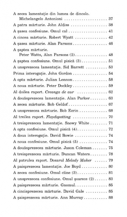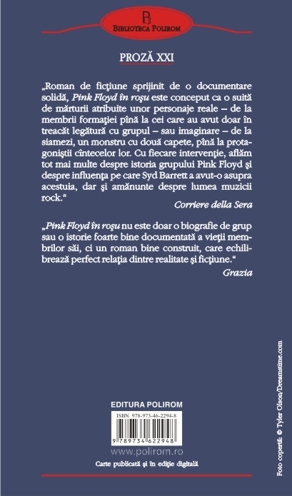 Traducere din limba italiana de Cerasela Barbone Pink Floyd in rosu (2010) este un roman experimental, in care rafuielile interne ale formatiei Pink Floyd devin un prilej pentru redarea metaforica a unui proces de creatie. Calatorie in lumea legendarului grup, puzzle de amintiri, marturisiri si istorii alternative, cartea ii ofera cititorului sansa de a afla secrete despre istoria formatiei, de a face cunostinta cu cei care l‑au avut in preajma pe Syd Barrett si cu aceia care au avut, fie si tangential, legatura cu Pink Floyd. Documentindu‑se si, in aceeasi masura, impletind strins fictiunea cu faptul istoric, autorul aduna la masa rotunda a naratiunii toate personajele in masura sa redea povestea unui mit, de la sunetisti, pina la celebritati ca Stanley Kubrick, David Bowie sau Michelangelo Antonioni. „Roman de fictiune sprijinit de o documentare solida, Pink Floyd in rosu este conceput ca o suita de marturii atribuite unor personaje reale – de la membrii formatiei pina la cei care au avut doar in treacat legatura cu grupul – sau imaginare – de la siamezi, un monstru cu doua capete, pina la protagonistii cintecelor lor. Cu fiecare interventie, aflam tot mai multe despre istoria grupului Pink Floyd si despre influenta pe care Syd Barrett a avut-o asupra acestuia, dar si amanunte despre lumea muzicii rock.“ (Corriere della Sera) „Pink Floyd in rosu nu este doar o biografie de grup sau o istorie foarte bine documentata a vietii membrilor sai, ci un roman bine construit, care echilibreaza perfect relatia dintre realitate si fictiune.“ (Grazia)