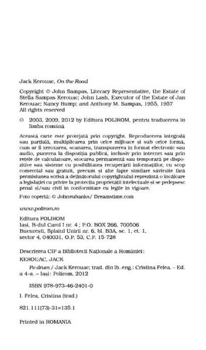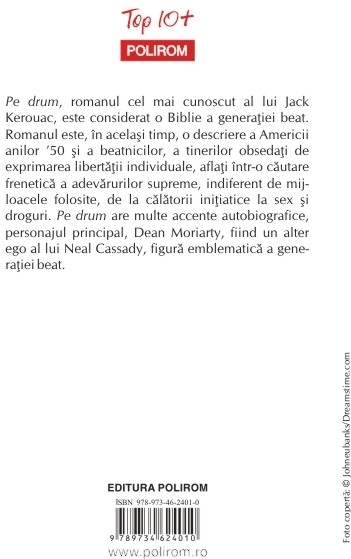 Traducere din limba engleza de Cristina Felea Pe drum, romanul cel mai cunoscut al lui Jack Kerouac, este considerat o Biblie a Generatiei Beat. Romanul este, in acelasi timp, o descriere a Americii anilor ’50 si a beatnicilor, a tinerilor obsedati de exprimarea libertatii individuale, aflati intr-o cautare frenetica a adevarurilor supreme, indiferent de mij-loacele folosite, de la calatorii initiatice la sex si droguri. Pe drum are multe accente autobiografice, personajul principal, Dean Moriarty, fiind un alter ego al lui Neal Cassady, figura emblematica a generatiei beat.