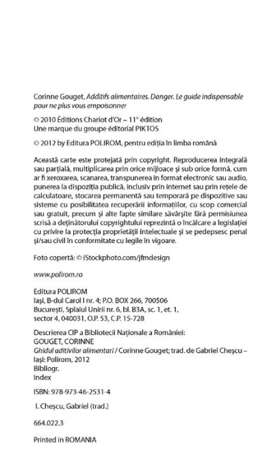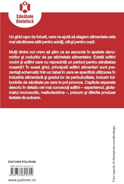 Multi dintre noi vrem sa stim ce se ascunde in spatele denumirilor si codurilor de pe etichetele alimentelor. Exista aditivi nocivi si aditivi care nu reprezinta un pericol pentru sanatatea noastra? In acest ghid, principalii aditivi alimentari sint prezentati schematic intr-un tabel in care se specifica utilizarea in industria alimentara si gradul lor de periculozitate, inclusiv tulburarile de sanatate pe care le pot provoca. Capitole separate descriu in detaliu cei mai cunoscuti aditivi – aspartamul, glutamatul monosodic, maltodextrina –, precum si diferite produse testate de autoare.