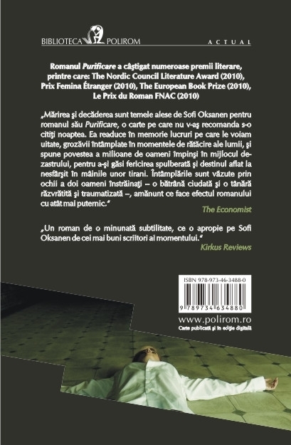 Traducere din limba finlandeza de Adela Victoria Korshin Romanul Purificare a cistigat numeroase premii literare, printre care: The Nordic Council Literature Award (2010), Prix Femina Etranger (2010), The European Book Prize (2010), Le Prix du Roman FNAC (2010) Romanul Purificare construieste o complexa drama de familie pe fundalul Estoniei rurale din timpul dictaturii sovietice si apoi din anii ’90, detaliind consecintele pe care le au abuzurile si violentele unui regim represiv. Aliide Truu isi traieste batrinetile in singuratate, la marginea unui sat depopulat, pregatindu-si leacurile si muraturile si ascultind radioul, cind in curtea ei apare peste noapte o fata necunoscuta, vorbind o estoniana invechita, cu accent rusesc. Fata este o fugara, iar din gesturile nervoase si speriate, din povestile pe care le spune, Aliide recunoaste in tinara speriata o victima a unor violente ce-i evoca dureros traume asemanatoare, pe care, la rindul ei, a trebuit sa le indure si sa le tainuiasca pentru a ramine in viata. Pe masura ce Aliide si Zara se apropie tot mai mult, legaturile dintre ele ies la lumina, dezvaluind amintiri reprimate si constientizarea unui rau ce continua sa faca victime mult timp dupa ce radacina sa a disparut. „Marirea si decaderea sint temele alese de Sofi Oksanen pentru romanul sau Purificare, o carte pe care nu v-as recomanda s-o cititi noaptea. Ea readuce in memorie lucruri pe care le voiam uitate, grozavii intimplate in momentele de ratacire ale lumii, si spune povestea a milioane de oameni impinsi in mijlocul de-zastrului, pentru a-si gasi fericirea spulberata si destinul aflat la nesfirsit in miinile unor tirani. Intimplarile sint vazute prin ochii a doi oameni instrainati – o batrina ciudata si o tinara razvratita si traumatizata –, amanunt ce face efectul romanului cu atit mai puternic.” (The Economist)Comandă online cartea "Purificare" la 10,60 lei isbn 9789734634880 scrisă de Sofi Oksanen , Sofi Oksanen, tiparită la editura Polirom face parte din colecția BIBLIOTECA POLIROM -> Actual. cu plata ramburs sau online cu cardul. Momentan titlul "Purificare" nu este disponibil însa vă puteți înscrie pentru a fi notificat în momenul reaprovizionarii.