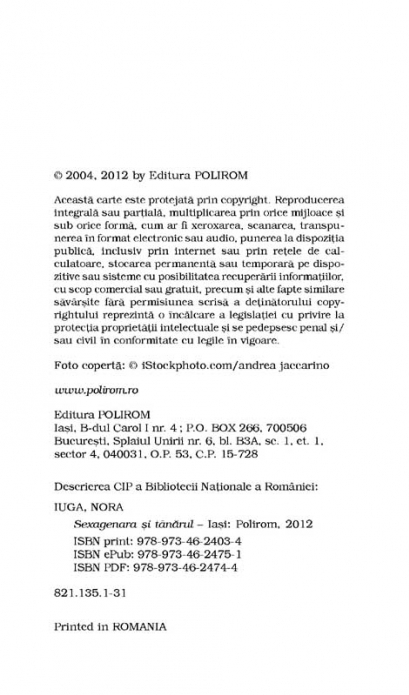 Comandă online cartea "Sexagenara și tînărul (ediție revăzută și adăugită, de buzunar)" la 19,69 lei isbn 9789734624034 scrisă de Nora Iuga, tiparită la editura Polirom face parte din colecția Top 10+. cu plata ramburs sau online cu cardul. Momentan titlul "Sexagenara și tînărul (ediție revăzută și adăugită, de buzunar)" nu este disponibil însa vă puteți înscrie pentru a fi notificat în momenul reaprovizionarii.