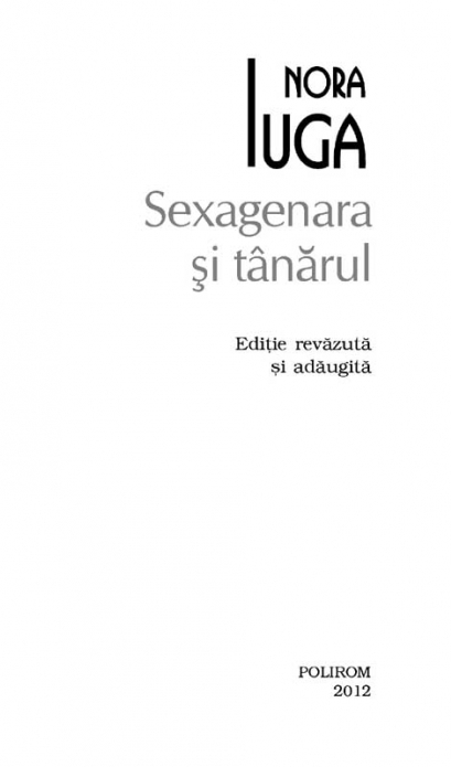 Editie revazuta si adaugita Romanul Sexagenara si tinarul, distins cu Premiul Uniunii Scriitorilor din Romania, a fost tradus in Bulgaria, Slovenia, Germania, Spania, Italia si urmeaza sa fie tradus in Franta. Asezata in fata unui barbat mult mai tinar decit ea, Anna isi istoriseste viata, amestecind amintirile despre tinutul natal, despre sotul ei Nino sau despre Terry, prietena care ii este mereu alaturi in diferite imprejurari, cu detalii amuzante privitoare la lumea literara a anilor ’70, dar si cu personaje si intimplari de mai tirziu. Rezultatul este o poveste densa, in mare masura autobiografica. „am observat ca hirtia pe care scrii este cea mai perfecta lada de gunoi, tot ce se aduna in exces acolo in creier si incepe sa doara trebuie desertat. si iubirile dau primele semnalul, eu sint un balon, un mic dirijabil, cind sacii de nisip ma tin pe loc, ii arunc pe rind si ma inalt.” (Nora Iuga)