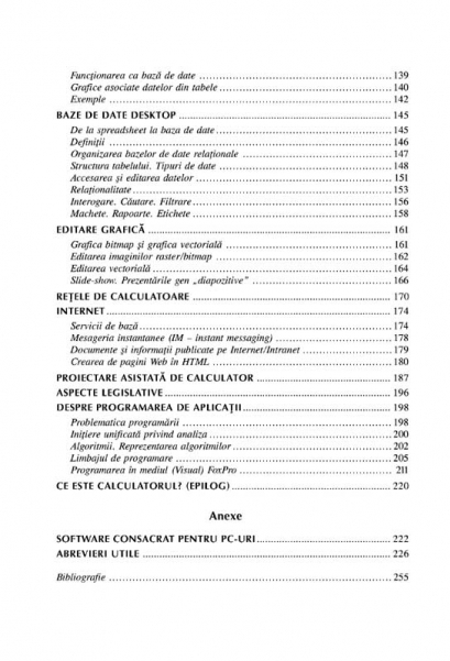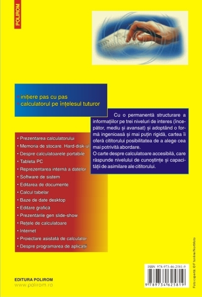 Editia a IV-a, revazuta si adaugita Cu o permanenta structurare a informatiilor pe trei niveluri de interes (incepator, mediu si avansat) si adoptind o forma ingenioasa si mai putin rigida, cartea ii ofera cititorului posibilitatea de a alege cea mai potrivita abordare. O carte despre calculatoare accesibila, care raspunde nivelului de cunostinte si capacitatii de asimilare ale cititorului.