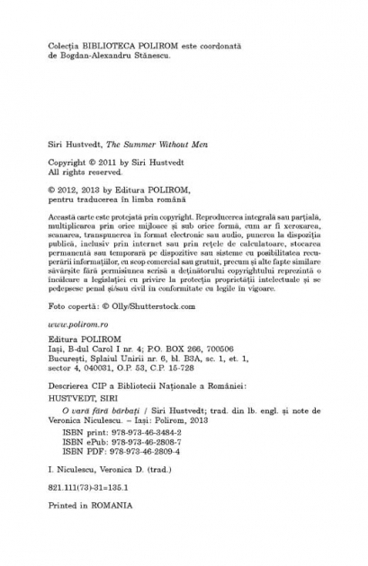 Traducere din limba engleza si note de Veronica D. Niculescu Scrisa la persoana intii, cu un rafinament si o finete remarcabile, O vara fara barbati este o carte despre descoperirea sinelui feminin, despre diferentele dintre sexe, despre maturizare, o remarcabila scufundare in universul profund al feminitatii. Mia Fredricksen, personajul principal din O vara fara barbati, pare o femeie implinita. Ajunsa la cincizeci si cinci de ani, are o cariera universitara, este o poeta cu un oarecare renume si are o fiica fermecatoare, care e actrita. Romanul debuteaza cu naruirea universului stabil al eroinei: dupa treizeci de ani de casnicie, sotul ei, Boris Izcovich, o paraseste, spunindu-i ca vrea sa ia o pauza. Numai ca Mia afla ca „pauza” este o colega a acestuia, cu douazeci de ani mai tinara. Dupa o cadere nervoasa, Mia se intoarce peste vara in Bonden, orasul copilariei sale, unde se integreaza intr-un univers exclusiv feminin, in care idiosincraziile si obsesiile batrinelor dintr-un azil alterneaza cu vitalitatea si cruzimea copilareasca a unui grup de fetite carora le preda un curs de poezie. „O vara fara barbati are aerul unei carti luminoase, in ciuda unui subiect de viata si de moarte... Printre partile cele mai incintatoare ale romanului se numara analizele asupra femeilor si barbatilor, dar si Mia insasi, personajul central, o fiinta onesta, spirituala si intelegatoare.” (The New York Times Book Review) „Romanul lui Siri Hustvedt poarta in el simbolul unui nou inceput. Povestea poetei Mia depaseste o tema dureroasa – des-tramarea unei casnicii, apropierea mortii, farsele chinuitoare ale unor fete puse pe rele – si are tot timpul in fundal autoironia si optimismul unei comedii caustice.” (The Guardian)Comandă online cartea "O vară fără bărbați" la 10,60 lei isbn 9789734634842 scrisă de Siri Hustvedt, tiparită la editura Polirom face parte din colecția BIBLIOTECA POLIROM -> Actual. cu plata ramburs sau online cu cardul. Momentan titlul "O vară fără bărbați" nu este disponibil însa vă puteți înscrie pentru a fi notificat în momenul reaprovizionarii.