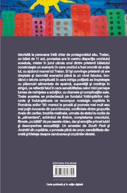Un amestec de South Park si Amintiri din copilarie, o poveste plina de umor, sensibilitate discreta si tristete despre candoarea si cruzimile virstei. Istorisita la persoana intii chiar de protagonistul sau, Traian, un baiat de 11 ani, povestea are in centru disparitia unchiului acestuia, mister in jurul caruia unul dintre prietenii baiatului construieste un scenariu in care unchiul a fost omorit de sotia lui, cu ajutorul mamei lui Traian. El isi convinge prietenii ca are dreptate si dezvolta scenariul pina la un nivel fabulos, brodind o istorie complicata in care intriga politista se impleteste cu plasmuiri alimentate de spaima, superstitii si credinta in strigoi, ce reflecta felul in care sensibilitatea celor mici percepe lumea de neinteles a adultilor, cu dramele si complicatiile sale. Toate acestea se proiecteaza pe fundalul intimplarilor ma-runte si induiosatoare ce recompun nostalgic copilaria in Romania anilor ’80: mersul la scoala si poznele mai mult sau mai putin inocente din jurul blocului, conflictele dintre grupurile rivale din cartier, trezirile matinale, urmate de statul la cozile de la „alimentara”, schimbul de timbre, completarea oracolului, filmele „cu batai” de pe casete video, dar si emotiile primei iubiri si descoperirea sexualitatii.