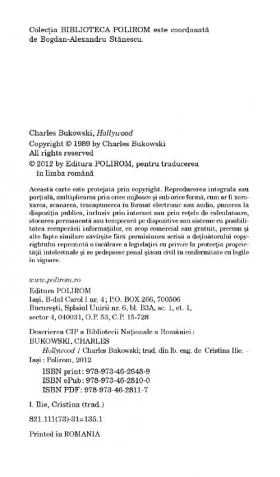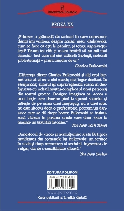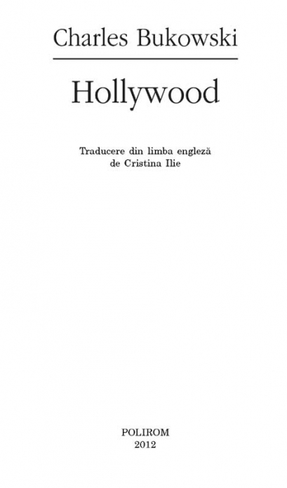 Traducere din limba engleza de Cristina Ilie Prin Hollywood, Bukowski isi povesteste experientele de scenarist din vremea cind, in anul 1987, lucra la turnarea unui film. Henry Chinaski, celebrul alter ego al lui Bukowski, revine de data aceasta cu un scenariu hollywoodian: The Dance of Jim Beam. Filmul este inspirat din experientele de scandalagiu petrecaret ale tinarului Chinaski, pe cind acesta nu era inca un scriitor cunoscut. Pe masura ce protagonistul, alaturi de iubita lui, Sarah, este prins de virtejul experientelor hollywoodiene, Bukowski agata cu ironie in firul parodic al evenimentelor si nume cunoscute din lumea culturala, transformindu‑le doar pe alocuri rezonanta: Jon‑Luc Modard, filozoful Jean‑Paul Sanrah, Frances Ford Lopalla si un anume Victor Norman ce aminteste de Norman Mailer. Prin reaparitia lui Henry Chinaski, cu pasiunile sale explozive pentru bautura, femei si curse de cai, prin ireverentiozitatea portretelor pe care le face, Hollywood marcheaza inca un moment in evolutia romanelor autobiografice ale lui Charles Bukowski. „Primesc o gramada de scrisori in care corespondentii imi vorbesc despre scrisul meu: «Bukowski, cum se face ca esti la pamint, si totusi supravietuiesti? Te-am tot citit si m-am hotarit sa nu ma mai sinucid.» Iata care-mi sint cititorii: invinsii, nebunii si blestematii – si sint mindru de ei.” (Charles Bukowski) „Diferenta dintre Charles Bukowski si alti eroi literari este ca el nu e nici martir, nici inger decazut. In Hollywood, autorul isi supravegheaza scena in desfasurare cu ochiul neutru-complice al unui personaj din teatrul grotesc. Desigur, imaginea sa, aceea a unui betiv care doarme pina la apusul soarelui si traieste de pe urma unui mestesug, nu a unei arte, nu este altceva decit o prefacatorie; precum un dansator care se da drept boxer, Bukowski se insinueaza viclean in postura unuia care doar «bate la masina» un text fara fasoane.” (The New York Times) „Amestecul de exces si nemultumire arata fara gres timiditatea din romanele lui Bukowski: un scriitor in acelasi timp mizantrop si sociabil, ingrozitor de vulgar, dar de o sensibilitate sfioasa.” (The New Yorker) Carte recomandata de