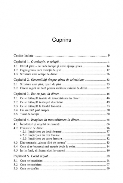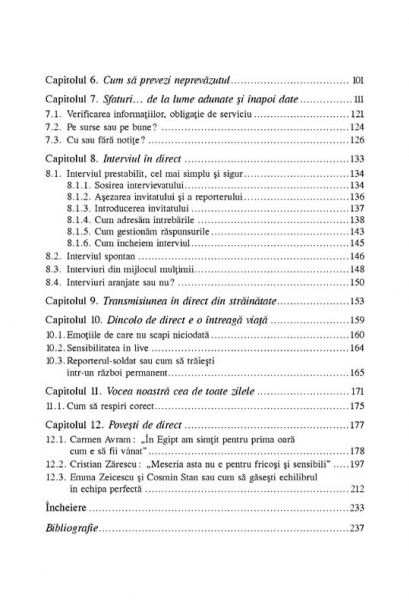 Transmisiunea in direct este utilizata tot mai frecvent de televiziuni pentru a-si dinamiza jurnalele, pentru a le face mai atractive si mai accesibile publicului. Acordind o atentie deosebita zonei stirilor, manualul ofera celor care doresc sa devina jurnalisti de televiziune informatii detaliate despre componenta redactiei, verificarea datelor, tipurile si structura stirilor, etapele unei transmisiuni in direct si prezenta reporterului in fata camerei – de la machiaj si vestimentatie pina la postura si gestica. Partea teoretica este completata de exemple din experienta reporterilor de teren, de recomandari facute de unii dintre cei mai cunoscuti jurnalisti de televiziune din Romania, precum si de exercitii care au ca scop dezvoltarea abilitatilor viitorilor reporteri. Din cuprins: O redactie, o echipa • Generalitati despre stirea de televiziune • Pas cu pas, in direct • Imaginea in transmisiunea in direct • Codul vizual • Cum sa prevezi neprevazutul • Interviul in direct • Trans-misiunea in direct din strainatate • Dincolo de direct e o intreaga viata • Vocea noastra cea de toate zilele