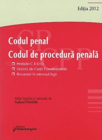 Editia a 3-a a lucrarii reda Codul penal, cu ultimele modificari si completari aduse prin Legea nr. 27/2012 in materia prescriptiei si prin Legea nr. 63/2012 privind confiscarea extinsa, si Codul de procedura penala, cu ultimele completari aduse prin Legea nr. 28/2012 privind valorificarea bunurilor mobile sechestrate.