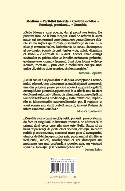 i-au fost totdeauna credinciosi –, toate refuzurile, implinirile si idiosincraziile suprarealismului pot fi regasite in acest roman sau, daca prefera autorul, in acest Pohem de iubire care este Zenobia.” (Monica Lovinescu)