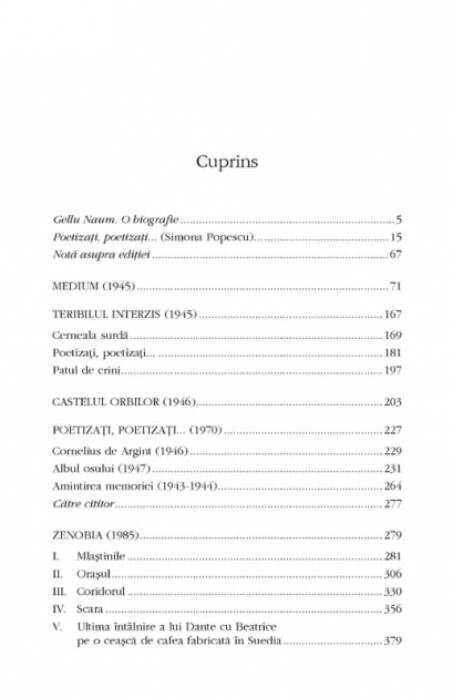 Dupa integrala poetica Gellu Naum, volumul de proza continua editia de referinta a operei poetului si prozatorului suprarealist. Acesta reuneste, in ordine cronologica, toate cartile de proza suprarealista ale autorului, de la Medium si Teribilul interzis, aparute in 1945, pina la Zenobia, romanul publicat pentru prima oara in 1985. Vor urma in seria de Opere un volum de teatru si altul cu texte de tinerete, inclusiv texte scrise in colaborare, dar si manifeste, corespondenta etc.
