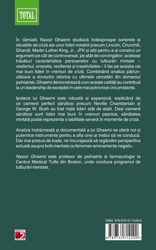 În Genialii, Nassir Ghaemi studiază îndeaproape carierele şi situaţiile de criză ale unor lideri notabili precum Lincoln, Churchill, Ghandi, Martin Luther King, Jr., JFK şi alţii pentru a-şi construi un argument pe cât de controversat, pe atât de convingător: aceleaşi trăsături caracteristice persoanelor cu tulburări mintale – realismul, empatia, rezilienţa şi creativitatea – îi fac pe aceştia cei mai buni lideri în vremuri de criză. Combinând analiza pătrunzatoare a dovezilor istorice cu ultimele cercetări din domeniul psihiatriei, Ghaemi demonstrează cum aceste calităţi au contribuit la un leadership de excepţie în cele mai potrivnice circumstante. Ipoteza lui Ghaemi este robustă şi expansivă, explicând de ce oamenii perfect sănătoşi precum Neville Chamberlain şi George W. Bush au fost nişte lideri atât de slabi. Deşi oamenii sănătoşi sunt lideri mai buni în vremuri paşnice, sănătatea mintală poate reprezenta o labilitate severă în momente de criză. Analiza îndrazneaţă şi documentată a lui Ghaemi ne oferă noi şi puternice instrumente pentru a afla cine ar trebui să ne conducă. Dar mai presus de toate, ne încurajează să regândim perspectiva actuală asupra bolii mentale ca fenomen eminamente negativ.
