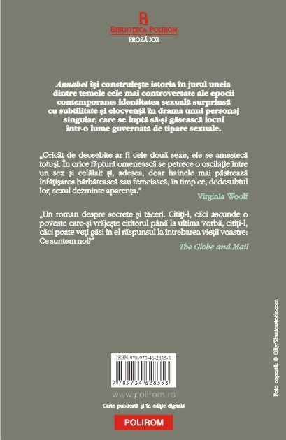 Annabel (2010), primul roman semnat de Kathleen Winter, abordeaza cu profunzime, sensibilitate si indrazneala una dintre temele cele mai controversate ale epocii contemporane: identitatea sexuala. Intr‑un sat pitoresc si indepartat de pe coasta Labradorului, unde rolurile barbatilor si ale femeilor sint guvernate de traditie, nasterea unui copil hermafrodit zguduie din temelii fericirea casnica a familiei Blake. Copilaria invaluita de mister a lui Wayne sta sub semnul ambiguitatii sexuale si al amenintarii cu demascarea publica. Lucrurile se complica si mai mult in momentul atingerii maturitatii sexuale, cind descopera ca organismul lui are capacitatea de a se reproduce singur. Kathleen Winter surprinde cu subtilitate si elocventa drama unui personaj singular, care se lupta sa‑si gaseasca locul intr‑o lume guvernata de tipare sexuale stricte, si in acelasi timp frumusetea inegalabila a peisajelor scaldate in luminile nordului din acest colt al Labradorului.