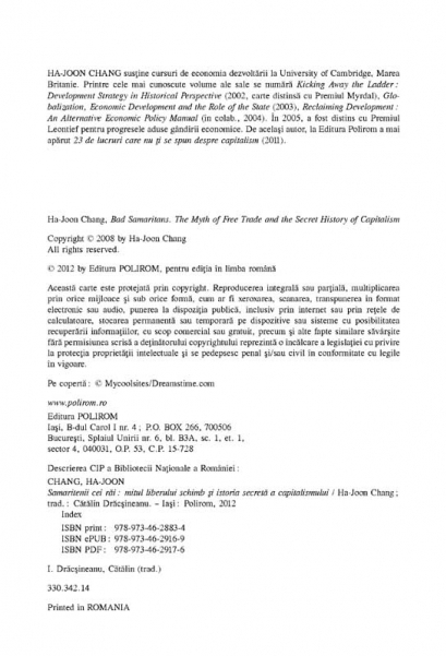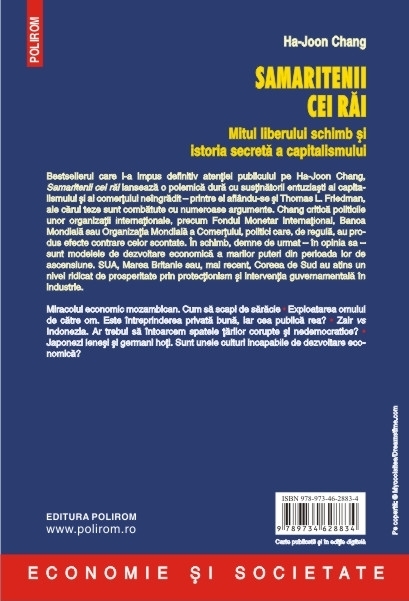 Traducere de Catalin Dracsineanu Bestsellerul care l-a impus definitiv atentiei publicului pe economistul sud-coreean Ha-Joon Chang, ale carui carti au fost traduse in 15 limbi. Samaritenii cei rai lanseaza o polemica dura cu sustinatorii entuziasti ai capitalismului si ai comertului neingradit – printre ei aflindu-se si Thomas L. Friedman, ale carui teze sint combatute cu numeroase argumente. Chang critica politicile unor organizatii internationale, precum Fondul Monetar International, Banca Mondiala sau Organizatia Mondiala a Comertului, politici care, de regula, au produs efecte contrare celor scontate. In schimb, demne de urmat – in opinia sa – sint modelele de dezvoltare economica a marilor puteri din perioada lor de ascensiune. SUA, Marea Britanie sau, mai recent, Coreea de Sud au atins un nivel ridicat de prosperitate prin protectionism si interventia guvernamentala in industrie. Din cuprins: Miracolul economic mozambican. Cum sa scapi de saracie • Exploatarea omului de catre om. Este intreprinderea privata buna, iar cea publica rea? • Zair vs Indonezia. Ar trebui sa intoarcem spatele tarilor corupte si nedemocratice? • Japonezi lenesi si germani hoti. Sint unele culturi incapabile de dezvoltare economica?