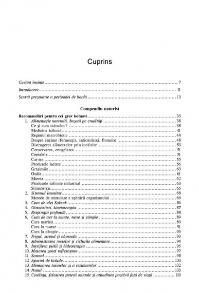 Editia a XV-a Una dintre cele mai vindute carti de medicina naturista din Romania Avantajele pe care ti le ofera natura sint evidente. Se elimina toxinele ce cauzeaza boala si nu mai sint afectate si alte organe. Inca din Antichitate, inteleptii duceau o viata in armo­nie cu natura. De indemnul lor de a trai sanatos trebuie sa tinem seama, folosind cit mai multe alimente netrecute prin foc, reducind carnea din alimentatie, evitind mesele supra­abundente. Valeriu Popa spunea ca ar fi suficient daca am minca un sfert din ceea ce consumam in mod obisnuit. „Trebuie sa avem incredere in capacitatea propriului organism de a se reface conform matricei genetice initiale, care este cea de sanatate. Nimic nu este imposibil cind ai credinta si rabdare. Si eu am trecut, pentru o perioada de timp, prin aceasta disperare, dar Dumnezeu imi indruma pasii si nu ma dau batuta. Am inteles ca boala este rezultatul unor greseli facute cu voie sau fara voie si al unor lectii de viata.” „Intelepciunea din subconstient si imaginatia creatoare pot modela fiecare celula, toate organele, nervii, muschii si, impreuna cu plantele, apa si soarele, pot sa aduca vindecarea. Revelatoare in acest sens sint cuvintele apostolului Marcu: «Toate cite cereti, rugindu-va, sa credeti ca le-ati primit si le veti avea». Credinta este tot gind acceptat de mentalul constient (sub forma de imagine). Esenta divina din noi, adevarul, reprezinta sanatatea, pacea, curatenia, bucuria, libertatea, iubirea.” (Speranta Anton) Din cuprins: Recomandari pentru cei grav bolnavi • Regimuri recomandate de Valeriu Popa • Program zilnic recomandat de Valeriu Popa pentru cei grav bolnavi (cancer) • Exercitii pentru redre­sare • Reguli generale de sanatate