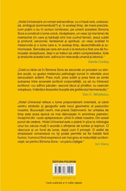 „Hotel Universal reface o lume preponderent orientala, al carei centru simbolic si geografic este locul geometric al pasiunilor noastre, Bucurestii vechi, mai precis Gabrovenii. Iar unitatea de timp este acea epoca ce mai dainuieste in amintirea pietrelor, incepind din «suta optsprezece» pina in zilele noastre. Din acest punct de vedere, Hotel Universal este o piatra in plus la mitologia unui loc caruia multi ii acorda o sfintenie de tumbe si lesinuri. O rascruce si un fund de lume, dupa cum il privesti. O astfel de amplasare romanesca nu isi poate permite sa fie tratata fara humor, humorul fiind examenul cel mai greu al maturitatii scriitoricesti, iar pentru Simona Sora – un pariu cistigat.” (Ion Vianu)