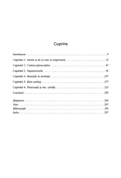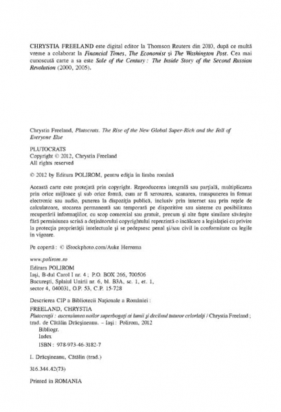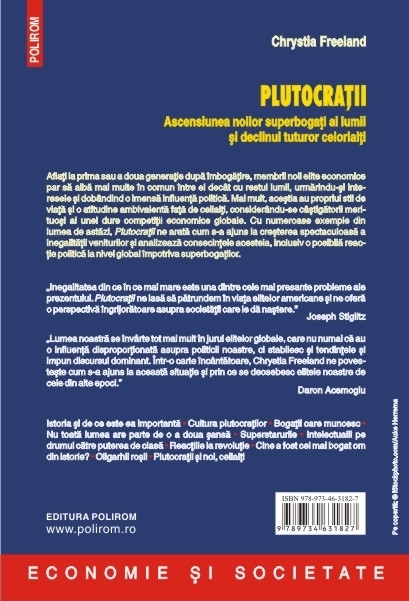 Traducere de Catalin Dracsineanu Aflati la prima sau a doua generatie dupa imbogatire, membrii noii elite economice par sa aiba mai multe in comun intre ei decit cu restul lumii, urmarindu-si interesele si dobindind o imensa influenta politica. Mai mult, acestia au propriul stil de viata si o atitudine ambivalenta fata de ceilalti, considerindu-se cistigatorii merituosi ai unei dure competitii economice globale. Cu numeroase exemple din lumea de astazi, Plutocratii ne arata cum s-a ajuns la cresterea spectaculoasa a inegalitatii veniturilor si analizeaza consecintele acesteia, inclusiv o posibila reactie politica la nivel global impotriva superbogatilor. „Inegalitatea din ce in ce mai mare este una dintre cele mai presante probleme ale prezentului. Plutocratii ne lasa sa patrundem in viata elitelor americane si ne ofera o perspectiva ingrijoratoare asupra societatii care le da nastere.” (Joseph Stiglitz) „Lumea noastra se invirte tot mai mult in jurul elitelor globale, care nu numai ca au o influenta disproportionata asupra politicii noastre, ci stabilesc si tendintele si impun discursul dominant. Intr-o carte incintatoare, Chrystia Freeland ne povesteste cum s-a ajuns la aceasta situatie si prin ce se deosebesc elitele noastre de cele din alte epoci.” (Daron Acemoglu) Din cuprins: Istoria si de ce este ea importanta • Cultura plutocratilor • Bogatii care muncesc • Nu toata lumea are parte de o a doua sansa • Superstarurile • Intelectualii pe drumul catre puterea de clasa • Reactiile la revolutie • Cine a fost cel mai bogat om din istorie? • Oligarhii rosii • Plutocratii si noi, ceilalti
