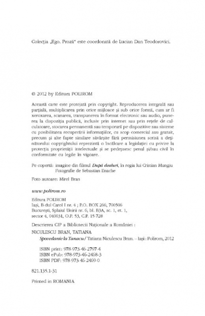 Romanul non-fictional a inspirat filmul Dupa dealuri (Beyond the Hills), in regia lui Cristian Mungiu, film dublu premiat la Festivalul de la Cannes 2012 (premiul pentru cel mai bun scenariu si premiul pentru interpretare feminină). De asemenea, filmul „Dupa dealuri” a cistigat Marele Premiu al sectiunii Filmmakers of Tomorrow - FEDEORA, la Festivalul International de Film de la Haifa, marele premiu al celei de-a 26-a editii a Festivalului de film de la Herceg Novi (Serbia) si premiul pentru cel mai bun film, la Festivalul de Film de la Vukovar, Croatia.Comandă online cartea "Spovedanie la Tanacu" la 10,60 lei isbn 9789734627974 scrisă de Tatiana Niculescu Bran , Tatiana Niculescu Bran, tiparită la editura Polirom face parte din colecția Ego. Proza. cu plata ramburs sau online cu cardul. Momentan titlul "Spovedanie la Tanacu" nu este disponibil însa vă puteți înscrie pentru a fi notificat în momenul reaprovizionarii.