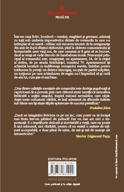 Traducere din limba maghiara de Marius Tabacu Intr-un oras fictiv, locuitorii – romani, maghiari si germani, adunati cu totii sub umbrela imperativelor dictate de vremurile in care s-a intimplat sa se nasca – traiesc sub teroarea istoriei: de la nesiguranta din anii de dupa sfirsitul razboiului, pina la caderea comunismului si inceputurile unei vieti noi, de care oamenii ar fi gata sa se bucure, daca ar reusi sa vada dincolo de harababura iscata. Personajul principal al romanului este, neasteptat, un apartament, 24, de la etajul al doilea, de pe strada Straduintei, numarul 79. Apartamentul isi schimba locatarii cu indiferenta cenusiului reavan, imbibat pentru totdeauna in pereti: un delator sinucigas, un stab de partid scapatat, un tortionar pe care schimbarea de regim nu-l impiedica sa-si vada de-ale lui, cum stie el mai bine. „Una dintre calitatile esentiale ale romanului este dorinta sugubeata si capricioasa de a povesti, prin care cititorul simte nemijlocit atmosfera imbicsita a arsitei orasului, inspira mirosul sarmalelor, care napadeste toate cotloanele cladirii, se lasa ademenit de sfircurile intarite sub bluze sau isi simte talpile spintecate de noroiul pietrificat.” (Irodalmi Jelen) „Daca ne imaginam fericirea ca pe un lac, cum poate ea sa incapa mai tirziu intr-un paharel de palinca? Dar nu mai are nici o importanta. E o inselatorie delicata si inevitabila a vietii, care nu poate fi nici masurata, nici cintarita, pentru ca nu exista o unitate de masura acceptabila, e doar plina de taine, de mii si mii de nuante ale intunericului.” (Sandor Zsigmond Papp)