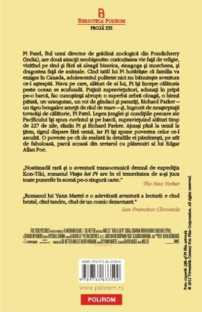 „Romanul lui Yann Martel e o adevarata aventura a lecturii: e cind brutal, cind tandru, cind de un comic dezarmant.” (San Francisco Chronicle)