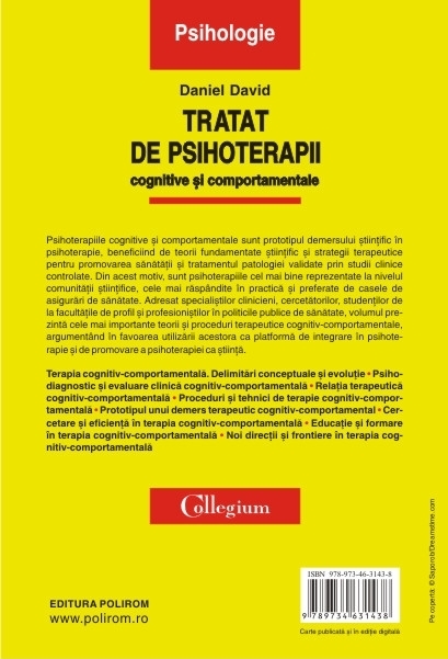 Editia a II-a revazuta si adaugita Psihoterapiile cognitive si comportamentale sint prototipul demersului stiintific in psihoterapie, beneficiind de teorii fundamentate stiintific si strategii terapeutice pentru promovarea sanatatii si tratamentul patologiei validate prin studii clinice controlate. Din acest motiv, sint psihoterapiile cel mai bine reprezentate la nivelul comunitatii stiintifice, cele mai raspindite in practica si preferate de casele de asigurari de sanatate. Adresat specialistilor clinicieni, cercetatorilor, studentilor de la facultatile de profil si profesionistilor in politicile publice de sanatate, volumul prezinta cele mai importante teorii si proceduri terapeutice cognitiv-comportamentale, argumentind in favoarea utilizarii acestora ca platforma de integrare in psihoterapie si de promovare a psihoterapiei ca stiinta.