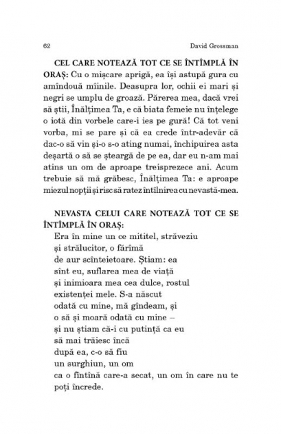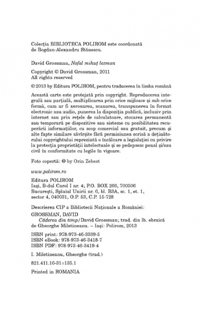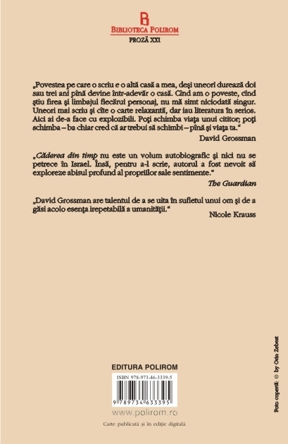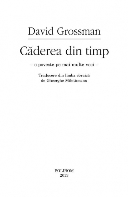 Traducere din limba ebraica de Gheorghe Miletineanu David Grossman este autorul bestsellerului Pina la capatul pamintului, roman distins in 2009 cu premiul Albatross, acordat de Fundatia Günter Grass din Germania, si in 2011 cu premiile Medicis Etranger si JQ Wingate. Cartea lui David Grossman, Caderea din timp, este un amplu si tulburator poem „pe mai multe voci”. Se spune ca timpul vindeca ranile, dar unele rani nu se vindeca niciodata. Unul dintre eroii cartii pleaca in cautarea a ceea ce a pierdut, sperind sa regaseasca acel ceva acolo, undeva, in afara timpului. Lunga pribegie „dincolo” este, pentru autorul cartii, prilejul unei rascolitoare meditatii asupra vietii si a mortii si o ravasitoare marturie de iubire parinteasca. Cartea este un recviem strabatut de credinta in fortele nesecate ale vietii si ale caldurii omenesti adevarate. „Povestea pe care o scriu e o alta casa a mea, desi uneori dureaza doi sau trei ani pina devine intr-adevar o casa. Cind am o poveste, cind stiu firea si limbajul fiecarui personaj, nu ma simt niciodata singur. Uneori mai scriu si cite o carte relaxanta, dar iau literatura in serios. Aici ai de-a face cu explozibili. Poti schimba viata unui cititor; poti schimba – ba chiar cred ca ar trebui sa schimbi – pina si viata ta.” (David Grossman) „Caderea din timp nu este un volum autobiografic si nici nu se petrece in Israel. Insa, pentru a-l scrie, autorul a fost nevoit sa exploreze abisul profund al propriilor sale sentimente.” (The Guardian) „David Grossman are talentul de a se uita in sufletul unui om si de a gasi acolo esenta irepetabila a umanitatii.” (Nicole Krauss) Carte recomandata de