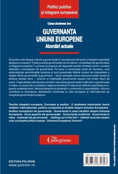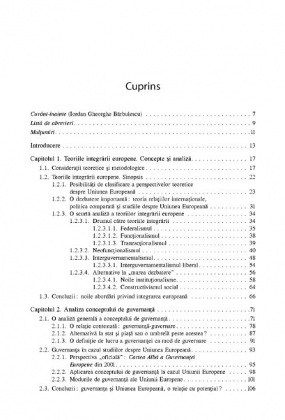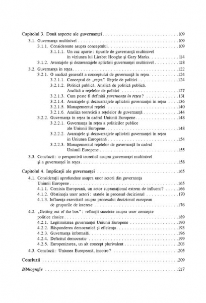 Din cuprins: Teoriile integrarii europene. Concepte si analiza • O dezbatere importanta: teoria relatiilor internationale, politica comparata si studiile despre Uniunea Europeana • Analiza conceptului de guvernanta • Guvernanta in cazul studiilor despre Uniunea Europeana • Doua aspecte ale guvernantei • Guvernanta multinivel • Guvernanta in retea • Implicatii ale guvernantei • „Getting out of the box”: reflectii succinte asupra unor concepte politice clasice • Uniunea Europeana, incotro?