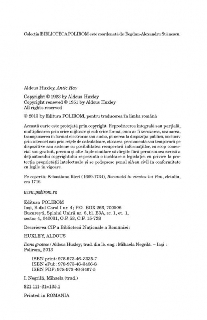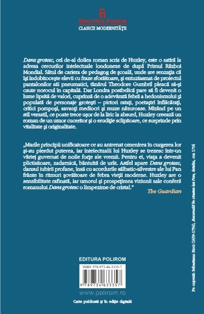 Traducere din limba engleza si note de Mihaela Negrila Dans grotesc, cel de-al doilea roman scris de Huxley, este o satira la adresa cercurilor intelectuale londoneze de dupa Primul Razboi Mondial. Satul de cariera de pedagog de scoala, unde are senzatia ca isi indobitoceste elevii cu fraze sforaitoare, si entuziasmat de proiectul pantalonilor sai pneumatici, tinarul Theodore Gumbril pleaca sa-si caute norocul in capitala. Dar Londra postbelica pare sa fi devenit o lume lipsita de valori, cuprinsa de o adevarata febra a hedonismului si populata de personaje grotesti – pictori ratati, poetastri inflacarati, critici pomposi, savanti mediocri si muze nazuroase. Mizind pe un stil versatil, ce poate trece usor de la liric la absurd, Huxley creeaza un roman de un umor cuceritor si o eruditie sclipitoare, ce surprinde prin vitalitate si originalitate. „Marile principii unificatoare ce au antrenat omenirea in curgerea lor si-au pierdut puterea, iar intelectualii lui Huxley se trezesc intr-un virtej guvernat de noile forte ale vremii. Pentru ei, viata a devenit plictisitoare, zadarnica, bintuita de urit. Astfel apare Dans grotesc, dansul iubirii profane, insa cu acordurile salbatic-silvestre ale lui Pan frinte in ritmuri sovaitoare de febra vietii moderne. Huxley are o sensibilitate rafinata, iar umorul si prospetimea viziunii sale confera romanului Dans grotesc o limpezime de cristal.” (The Guardian)