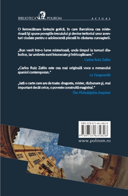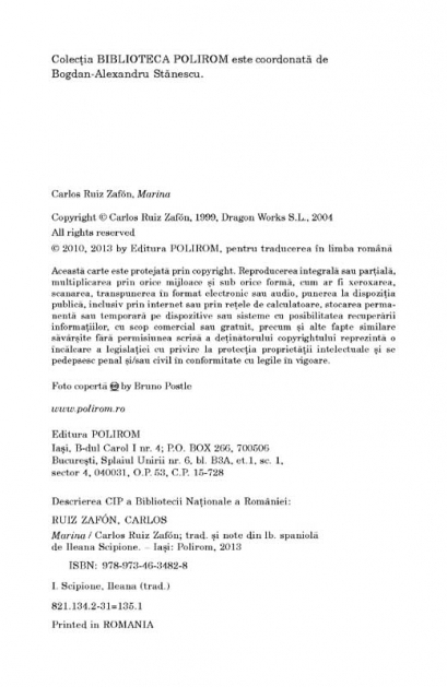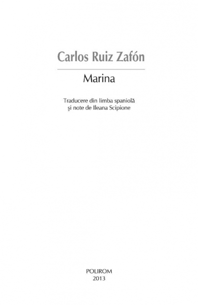 O fermecatoare fantezie gotica, in care Barcelona cea misterioasa isi spune povestile trecutului si devine teritoriul unor aventuri ciudate pentru o adolescenta plecata in cautarea cunoasterii. In Barcelona de la sfirsitul anilor ’70, se naste prietenia stranie dintre Oscar Drai, un adolescent pasionat de mister si aventura, si tinara Marina, care locuieste cu tatal sau, pictorul Germán, intr-un mic castel enigmatic. Din cite afla Oscar, cei doi ascund secrete de familie dintre cele mai intunecate, in care se amesteca imaginea unei fabrici de proteze ortopedice, cadavre readuse la viata, monstri si povesti de dragoste neobisnuite. „Bun venit intr-o lume misterioasa, unde timpul ia turnuri diabolice, iar umbrele sint intunecate si infricosatoare.” (Carlos Ruiz Zafon) „Carlos Ruiz Zafon este cea mai originala voce a romanului spaniol contemporan.” (La Vanguardia) „Iata o carte care are de toate: dragoste, mister, razbunare si, mai important decit orice, o poveste construita magistral.” (The Philadelphia Enquirer)Comandă online cartea "Marina" isbn 9789734634828 scrisă de Carlos Ruiz Zafon , Carlos Ruiz Zafón, tiparită la editura Polirom face parte din colecția BIBLIOTECA POLIROM -> Actual. cu plata ramburs sau online cu cardul. Momentan titlul "Marina" nu este disponibil însa vă puteți înscrie pentru a fi notificat în momenul reaprovizionarii.
