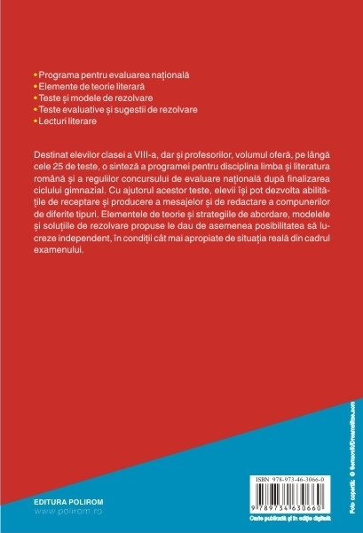 Destinat elevilor clasei a VIII-a, dar si profesorilor, volumul ofera, pe linga cele 25 de teste, o sinteza a programei pentru disciplina limba si literatura romana si a regulilor concursului de evaluare nationala dupa finalizarea ciclului gimnazial. Cu ajutorul acestor teste, elevii isi pot dezvolta abilitatile de receptare si producere a mesajelor si de redactare a compunerilor de diferite tipuri. Elementele de teorie si strategiile de abordare, modelele si solutiile de rezolvare propuse le dau de asemenea posibilitatea sa lucreze independent, in conditii cit mai apropiate de situatia reala din cadrul examenului. • Programa pentru evaluarea nationala • Elemente de teorie literara • Teste si modele de rezolvare • Teste evaluative si sugestii de rezolvare • Lecturi literare