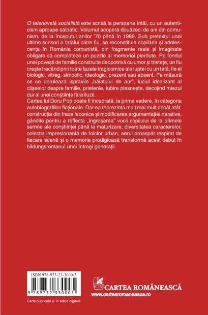 O telenovela socialista este scrisa la persoana intii, cu un autenticism aproape salbatic. Volumul acopera douazeci de ani din comunism, de la inceputul anilor ’70 pina in 1989. Sub pretextul unei ultime scrisori a tatalui catre fiu, se reconstituie copilaria si adolescenta in Romania comunista, din fragmente reale si imaginate obligate sa completeze un puzzle al memoriei pierdute. Pe fondul unei povesti de familie construite deopotriva cu umor si tristete, un fiu creste trecind prin toate fazele tragicomice ale luptei cu un tata, fie el biologic, vitreg, simbolic, ideologic, prezent sau absent. Pe masura ce se deruleaza ispravile „baiatului de aur”, luciul idealizant al cliseelor despre familie, prietenie, iubire plesneste, decojind miezul dur al unei constiinte fara iluzii. Cartea lui Doru Pop poate fi incadrata, la prima vedere, in categoria autobiografiilor fictionale. Dar ea reprezinta mult mai mult decit atit: constructia din fraze laconice si modificarea argumentatiei narative, gindite pentru a reflecta „ingrosarea” vocii copilului de la primele semne ale constiintei pina la maturizare, diversitatea caracterelor, colectia impresionanta de folclor urban, aerul proaspat respirat de fiecare scena si o memorie prodigioasa transforma acest debut in bildungsromanul unei intregi generatii.