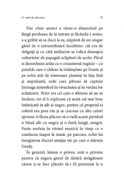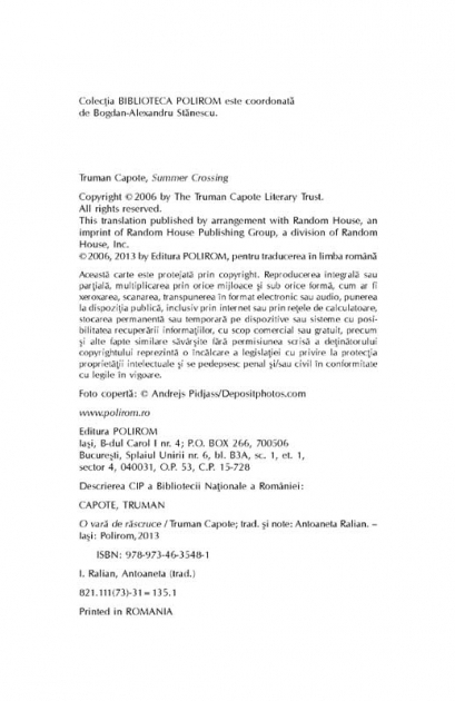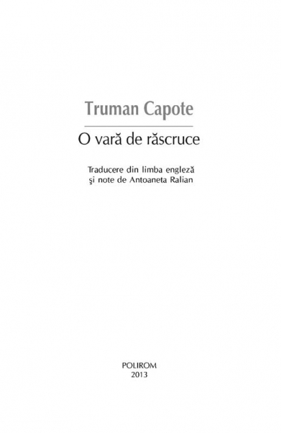 Traducere din limba engleza si note de Antoaneta Ralian O vara de rascruce, povestea unei adolescente din inalta societate newyorkeza a anilor ’40, este primul roman al lui Truman Capote, inceput in 1943 si abandonat cinci ani mai tirziu. Desi Capote se reintoarce periodic la manuscris, nu-l finalizeaza niciodata – mai mult, in 1966, cind isi paraseste locuinta din Brooklyn, printre obiectele lasate in urma se numara si cele patru caiete continind textul si notele cartii. Considerate de biografii sai pierdute pentru totdeauna, ele au fost recuperate in 2004, la douazeci de ani de la moartea autorului, pentru ca doi ani mai tirziu sa vada, in sfirsit, lumina tiparului. Aparitia, intirziata cu patru decenii, a ceea ce ar fi trebuit sa fie romanul de debut al lui Capote a constituit unul dintre cele mai importante evenimente editoriale ale ultimilor ani, iar destinul lui senzational adauga o ultima pata de culoare biografiei tumultuoase a autorului sau. „Truman Capote este cel mai desavirsit scriitor din generatia mea.” (Norman Mailer) „Proza lui Capote are fragmente cu adevarat geniale, precum acela in care vorbeste despre valul de caldura ce acopera orasul: «Arsita despica craniul orasului si scoate la iveala creierul lui alb». Pagina dupa pagina, descrierile emotionante se inlantuie; romanul este, intr-adevar, un imn inchinat New Yorkului si merita citit fie doar si pentru acest lucru.” (The Guardian) „O descoperire senzationala atit pentru critici, cit si pentru cititori.” (Kirkus Review)