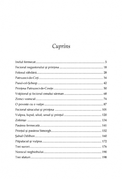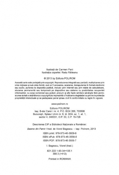 Traducere din limba persana si dialecte iranice de Viorel Bageacu Ilustratii de Carmen Parii Bine ati venit in lumea fermecata a povestilor din Pamir, „acoperisul lumii”, meleaguri strabatute odinioara de caravane de pe Drumul Matasii! Aici veti gasi cai inaripati si pasari maiastre, cetati unde salasluiesc divii cei temuti, lacuri pazite de balauri, izvorul ce implineste dorintele si lauta care ride si vorbeste cu glas omenesc. Aici, pastori saraci ajung sa ia de soate fiice de sahi, iar cine se arata darnic este rasplatit insutit. Drumul trece prin pustiuri intinse si codri adinci, dar si prin orase cu palate si gradini incintatoare. Primejdiile nu lipsesc, insa vietuitoare mari si mici sint gata sa ne dea ajutor, iar cei cu inima buna vor trece intotdeauna cu bine prin incercari. Sa pornim deci impreuna! Inelul fermecat • Feciorul negustorului si printesa • Puiul-cel-Schiop • Printesa Patruzeci-de-Cosite • Vrajitorul si feciorul omului sarman • Zemci voinicul • Feciorul saracului si printesa • Vulpea, lupul, uliul, ursul si printul • Pasarea fermecata • Printul si pasarea Simorgh • Pitpalacul si vulpea • Trei surori • Norocul neghiobului