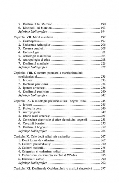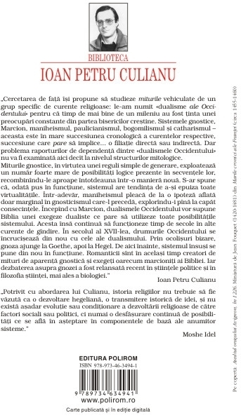 Editia a III-a Traducere de Tereza Culianu‑Petrescu Cuvint inainte al autorului Postfata de H.‑R. Patapievici Ioan Petru Culianu face o analiza a religiilor dualiste a caror istorie a influentat in mod profund Occidentul: gnosticismul, marcionismul, maniheismul, paulicianismul, bogomilismul si catharismul occitan si lombard. Volumul umple o lacuna din istoria ideilor infatisind o descoperire fundamentala: curentele dualiste formeaza un sistem, ele nu deriva unul din altul, ci reprezinta rezultatul acelorasi operatiuni mentale, pornind de la aceleasi premise si de la un singur text: primele trei capitole ale Genezei biblice. Culianu demonstreaza ca premisele dualismului genereaza un sistem care are tendinta de a se perpetua la nesfirsit si care exista, aici si acum, in ideile noastre filosofice, politice, stiintifice si chiar in fluxul propriilor noastre ginduri. „Cercetarea de fata isi propune sa studieze miturile vehiculate de un grup specific de curente religioase: le-am numit «dualisme ale Occidentului» pentru ca timp de mai bine de un mileniu au fost tinta unei preocupari constante din partea bisericilor crestine. Sistemele gnostice, Marcion, maniheismul, paulicianismul, bogomilismul si catharismul – aceasta este in mare succesiunea cronologica a curentelor respective, succesiune care pare sa implice... o filiatie directa sau indirecta. Dar problema raporturilor de dependenta dintre «dualismele Occidentului» nu va fi examinata aici decit la nivelul structurilor mitologice. Miturile gnostice, in virtutea unei reguli simple de generare, exploateaza un numar foarte mare de posibilitati logice prezente in secventele lor, recombinindu-le aproape intotdeauna intr-o maniera noua. S-ar spune ca, odata pus in functiune, sistemul are tendinta de a-si epuiza toate virtualitatile. Intr-adevar, maniheismul pleaca de la o ipoteza aflata doar marginal in gnosticismul care-l preceda, explorindu-i pina la capat consecintele. Incepind cu Marcion, dualismele Occidentului vor supune Biblia unei exegeze dualiste ce pare sa utilizeze toate posibilitatile sistemului. Acesta insa continua sa functioneze timp de secole in alte curente de gindire. In secolul al XVII-lea, drumurile Occidentului se incruciseaza din nou cu cele ale dualismului. Prin ocolisuri bizare, gnoza ajunge la Goethe, apoi la Hegel. De aici inainte, sistemul insusi se pune din nou in functiune. Romanticii sint in acelasi timp creatori de mituri de aparenta gnostica si exegeti oarecum marcioniti ai Bibliei. Iar dezbaterea asupra gnozei a fost relansata recent in stiintele politice si in filozofia stiintei, mai ales a biologiei.” (Ioan Petru Culianu) „Potrivit cu abordarea lui Culianu, istoria religiilor nu trebuie sa fie vazuta ca o dezvoltare hegeliana, o transmitere istorica de idei, si nu exista asadar evolutie sau conditionare a dezvoltarii religioase de catre factori sociali sau politici, ci numai o desfasurare continua de posibilitati ce se afla in asteptare in componentele de baza ale anumitor sisteme.” (Moshe Idel)
