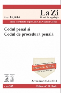 Coordonată de prof. univ. dr. Valerian Cioclei, această ediţie a lucrării Codul penal şi Codul de procedură penală aduce în atenţia celor interesaţi nu numai textul actualizat al Codului penal şi, respectiv, al Codului de procedură penală, ci şi recursurile în interesul legii admise, pentru a se asigura o completă cunoaştere şi înţelegere a dispoziţiilor legale din textul celor două Coduri. Acestea sunt situate, în rezumat, direct sub articolul din Cod la care se referă. în plus, cititorul mai poate găsi şi alte informaţii utile, cum ar fi note de subsol cu trimitere la ultima modificare a articolului avut în vedere, index, istoric etc.