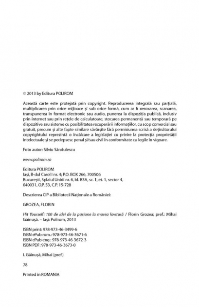Hit Yourself. 100 de idei de la pasiune la marea lovitura contine 100 de idei si sfaturi inspirate din povestile de succes ale artistilor romani peste hotare. Cartea aduce un suflu nou si provoaca cititorul, prin povesti adevarate, dar si prin sfaturile unuia dintre cei mai indragiti artisti ss inoveze, ss isi puna pe portativ creativitatea si sa gaseasca cheia succesului. Urmati aceste sfaturi si in scurt timp, dintr-un artist independent cu resurse financiare limitate, puteti deveni un autor de hituri sau un star international.
