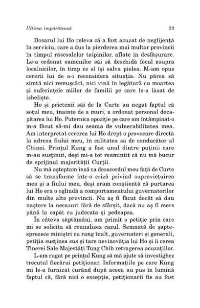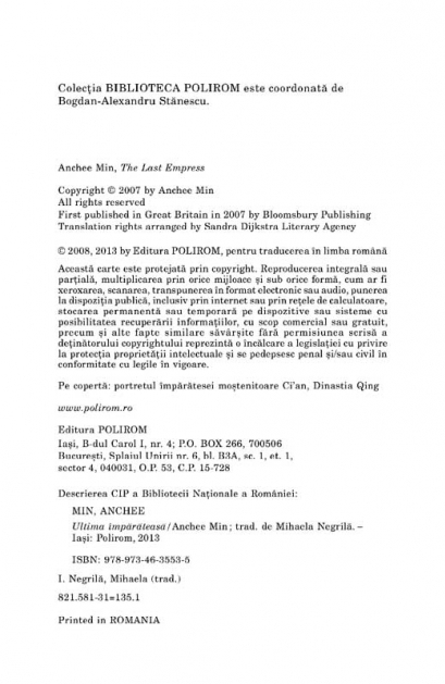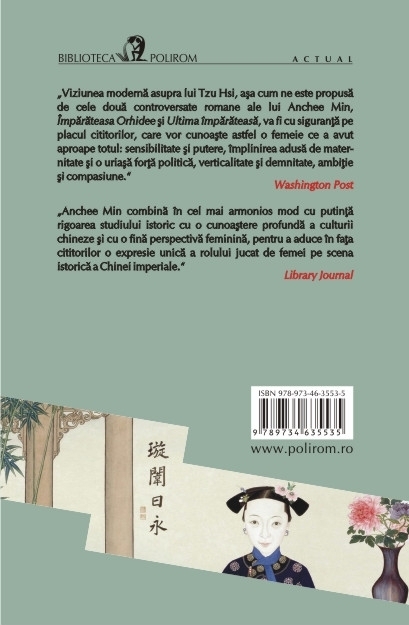 Ediția 2013 Traducere din limba engleza de Mihaela Negrila Conceput ca o continuare a povestilor fascinante descrise in Imparateasa Orhidee si a intrigilor infiripate in misteriosul Oras Interzis, acest ultim roman semnat de Anchee Min duce pina la capat reinterpretarea din perspectiva moderna a vietii tumultuoase a ultimei si celei mai controversate imparatese din istoria Chinei. Ultima imparateasa este de fapt povestea dramatica a transformarii Orhideei dintr-o tinara puternica si increzatoare intr-o conducatoare abila, capabila sa tina friiele unui imperiu in declin, o poveste in care dramele personale din palatele tainice ale Orasului Interzis devin pe nesimtite tragediile istorice ale unui intreg popor. Confruntata cu necesitatea de a-si asuma o dubla regenta, cu pierderea prematura a doi fii, cu pasiuni amoroase reprimate pina in ultima clipa a vietii, cu invazia Marilor Puteri si ingenuncherea morala si economica a Chinei, imparateasa Tzu Hsi se dovedeste, in viziunea lui Anchee Min, o femeie capabila sa sacrifice totul in numele adevarului si al dreptatii, dezmintind profetia conform careia „China va fi distrusa de o femeie”. „Viziunea moderna asupra lui Tzu Hsi, asa cum ne este propusa de cele doua controversate romane ale lui Anchee Min, Imparateasa Orhidee si Ultima imparateasa, va fi cu siguranta pe placul cititorilor, care vor cunoaste astfel o femeie ce a avut aproape totul: sensibilitate si putere, implinirea adusa de maternitate si o uriasa forta politica, verticalitate si demnitate, ambitie si compasiune.” (Washington Post) „Anchee Min combina in cel mai armonios mod cu putinta rigoarea studiului istoric cu o cunoastere profunda a culturii chineze si cu o fina perspectiva feminina, pentru a aduce in fata cititorilor o expresie unica a rolului jucat de femei pe scena istorica a Chinei imperiale.” (Library Journal)