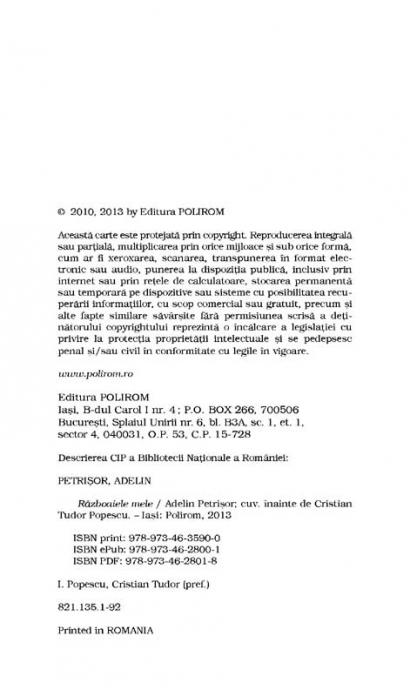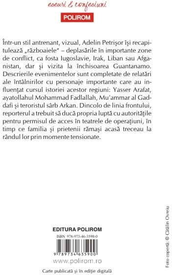 Editia a II-a Cuvint inainte de Cristian Tudor Popescu Intr-un stil antrenant, vizual, Adelin Petrisor isi recapituleaza „razboaiele” – deplasarile in importante zone de conflict, ca fosta Iugoslavie, Irak, Liban sau Afganistan, dar si vizita la inchisoarea Guantanamo. Descrierile evenimentelor sint completate de relatari ale intilnirilor cu personaje importante care au influentat cursul istoriei acestor regiuni: Yasser Arafat, ayatollahul Mohammad Fadlallah, Mu’ammar al Gaddafi si teroristul sirb Arkan. Dincolo de linia frontului, reporterul a trebuit sa duca propria lupta cu autoritatile pentru permisul de acces in teatrele de operatiuni, in timp ce familia si prietenii ramasi acasa treceau la rindul lor prin momente tensionate.